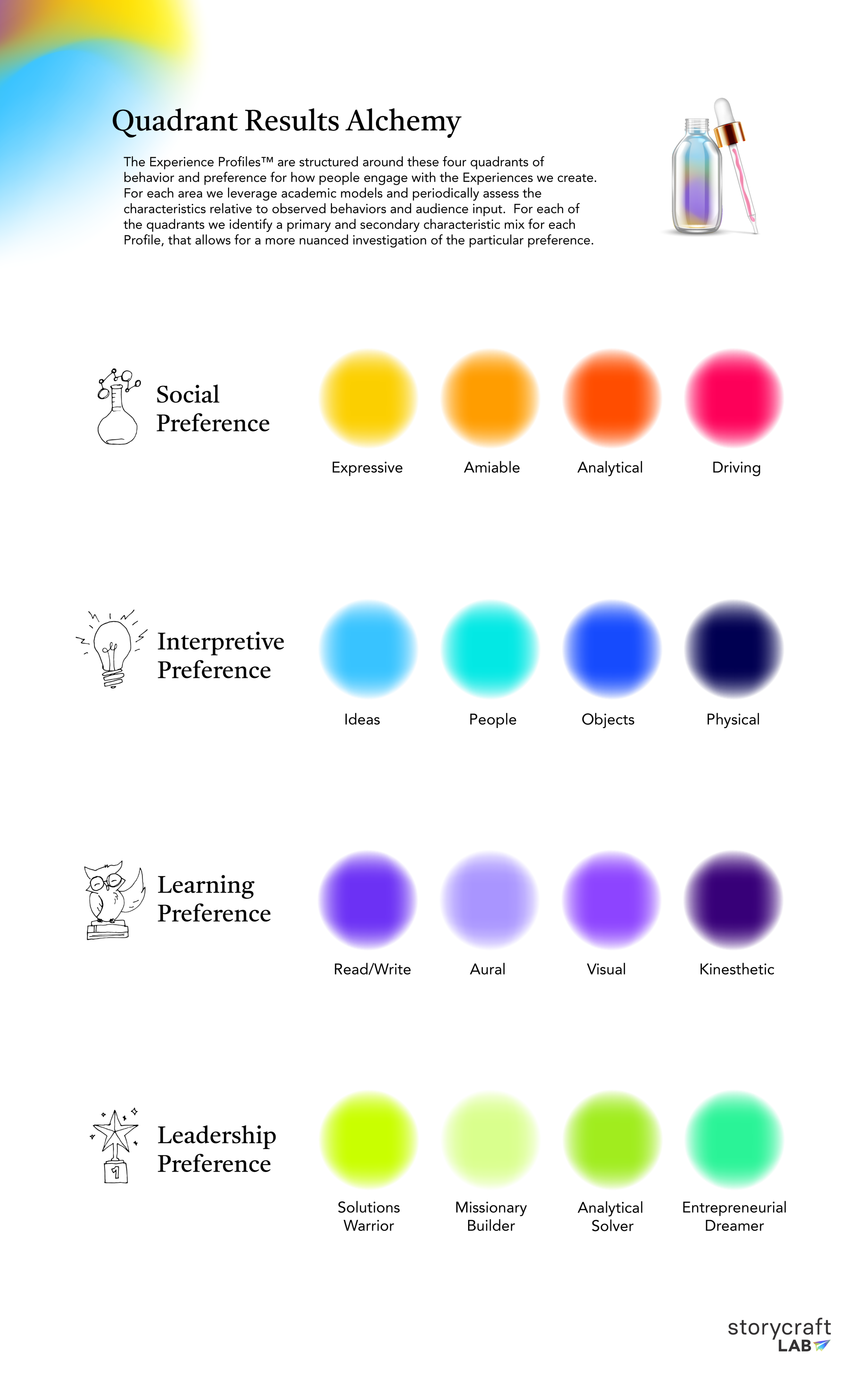 The Experience Profiles™ are created around unique combinations of scores in the four quadrants of social, interpretive, learning and leadership behaviors and preferences. As we build the profiles we also consider the characteristics for each quadrant with nuance, returning a primary and secondary set of preferences: